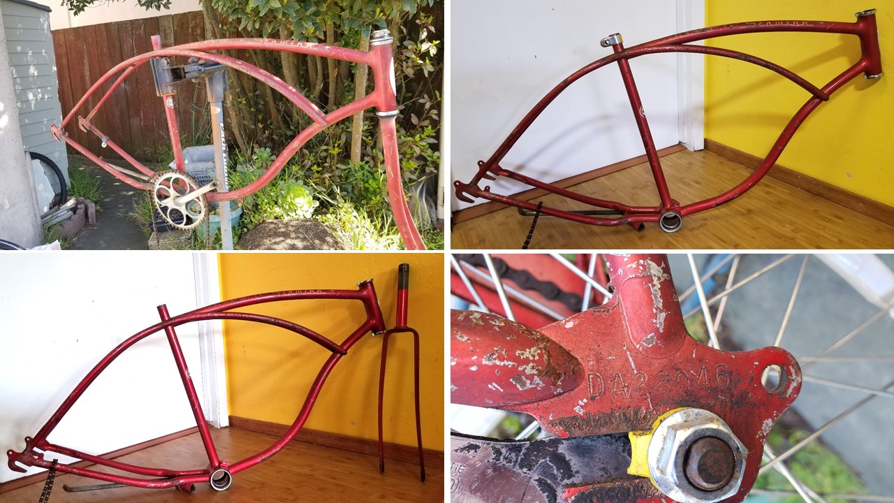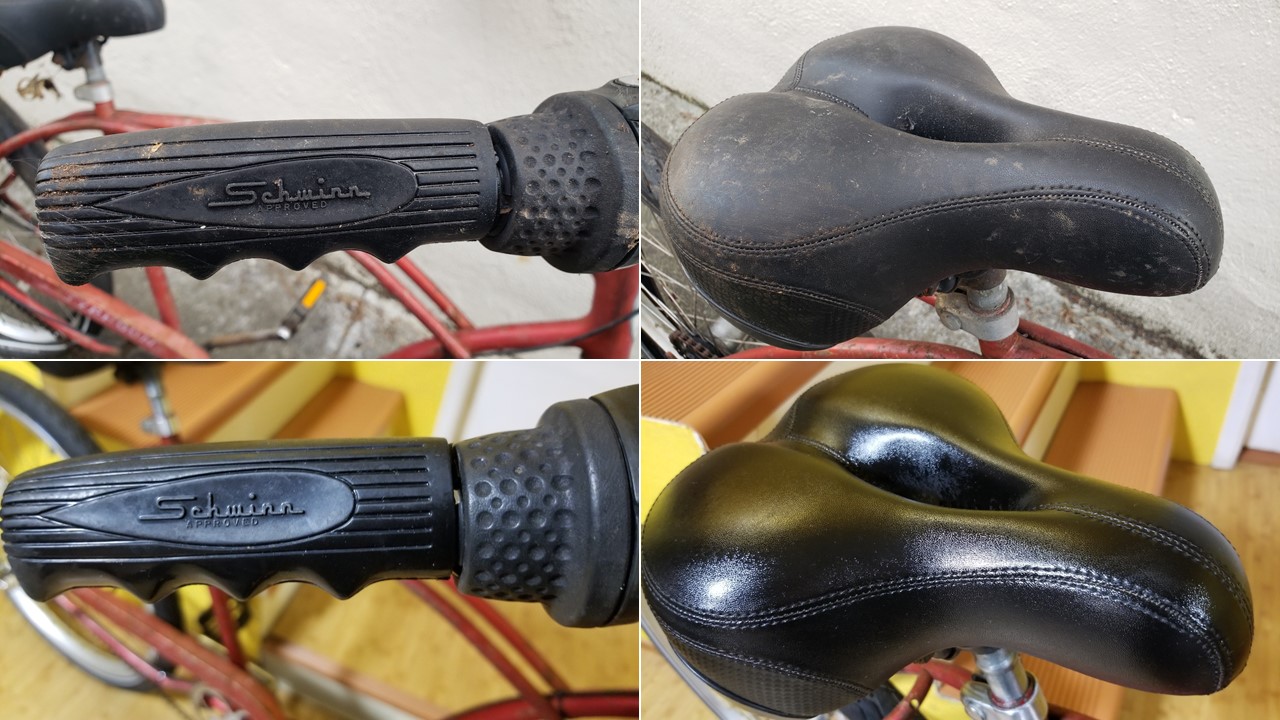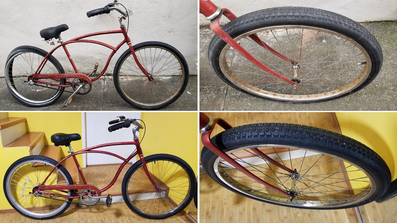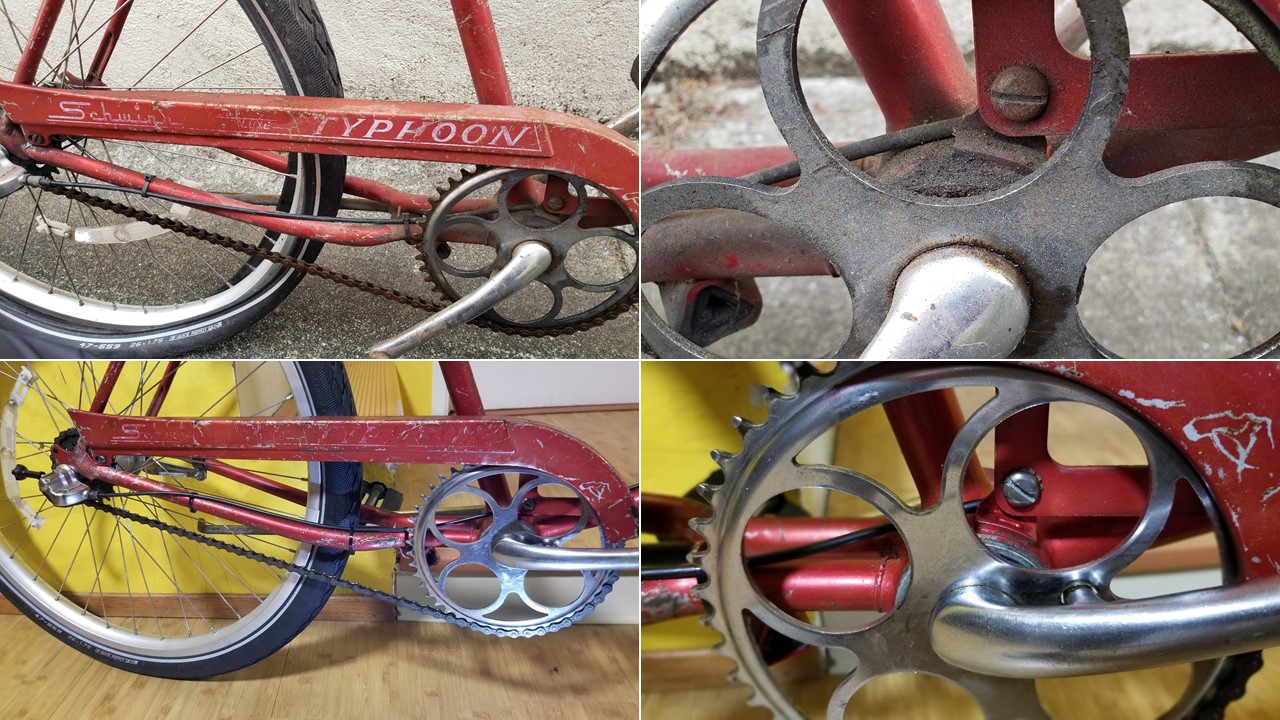 This classic Schwinn Typhoon Deluxe was upgraded before I got it with a modern 26″-diameter rear wheel and a Shimano Nexus 3-speed internal hub and twist shifter. The original front wheel uses a Schwinn 26x2x1-3/4″ tire. More info on this bike in the 1965 Schwinn Catalog. We preserved the original “flamboyant red” color of the curved frame and fork with a coat of wax.