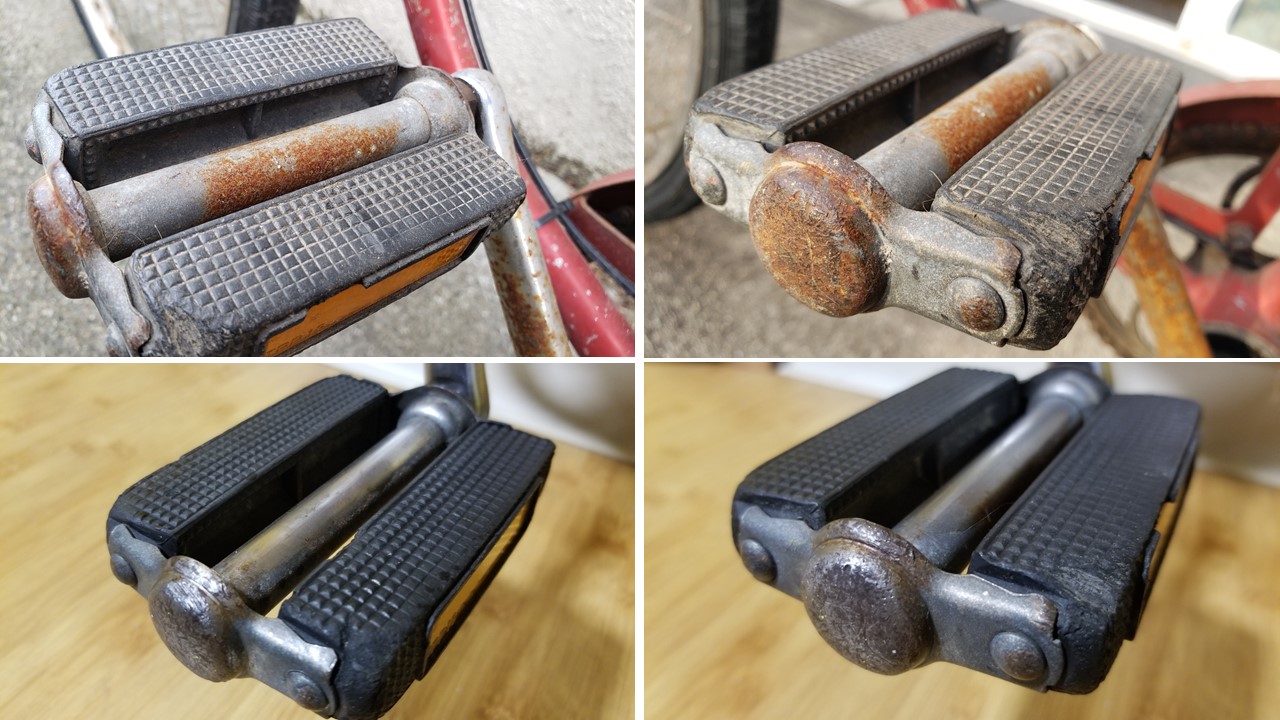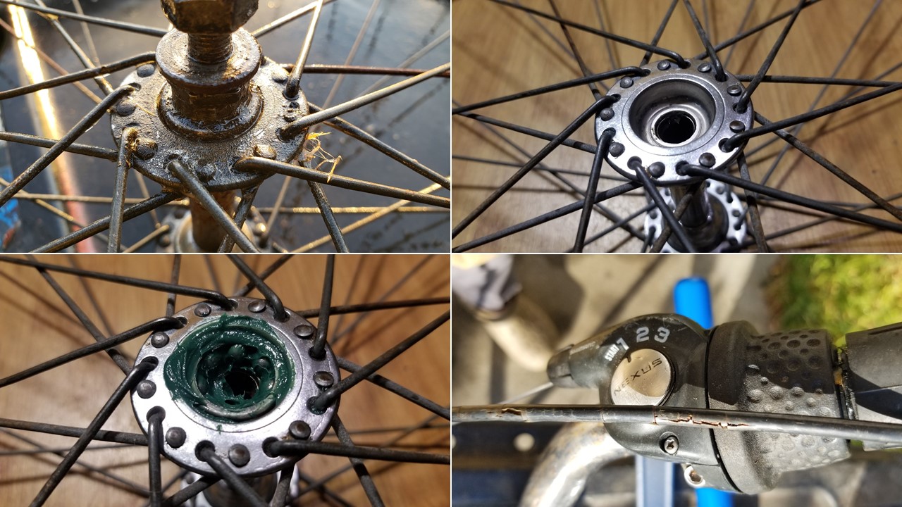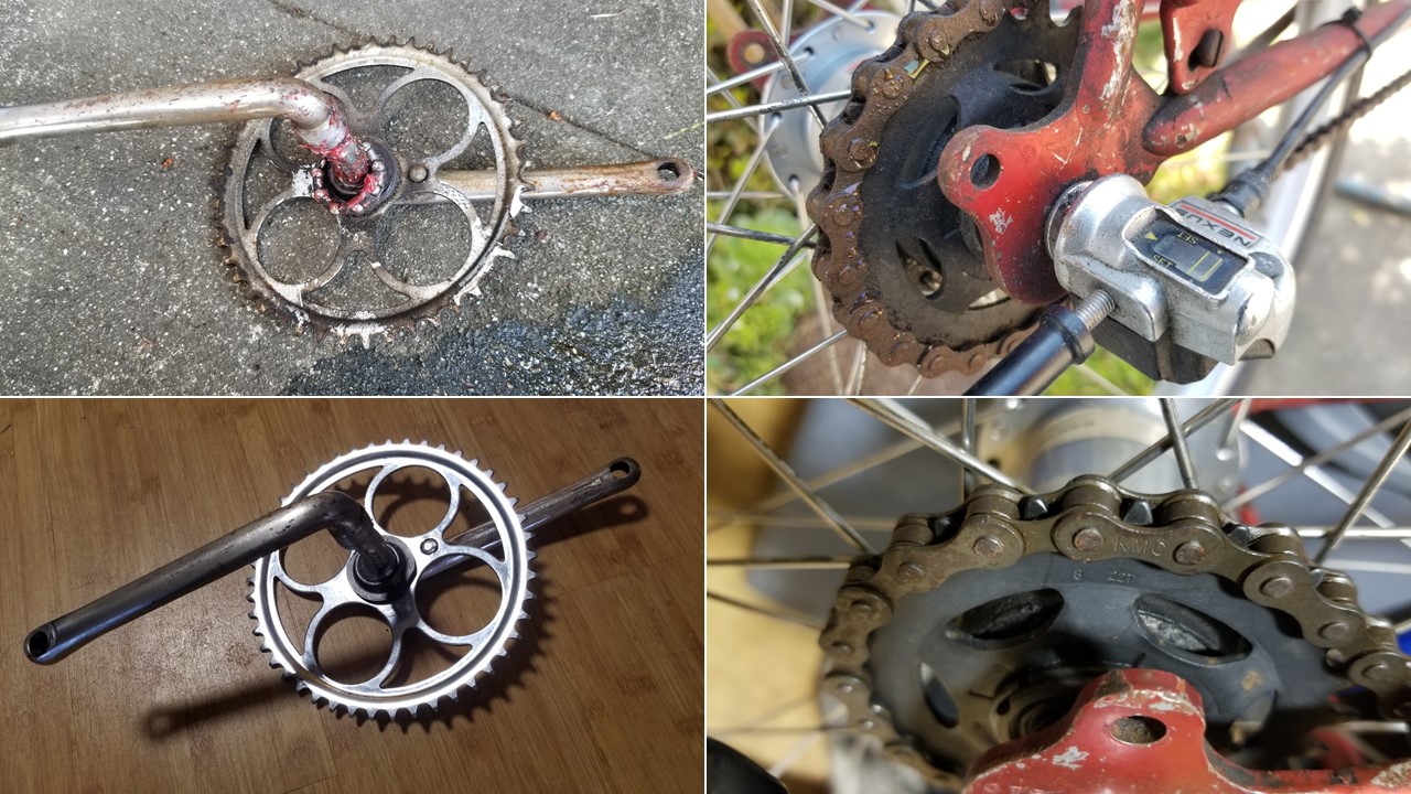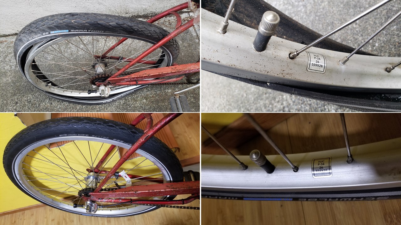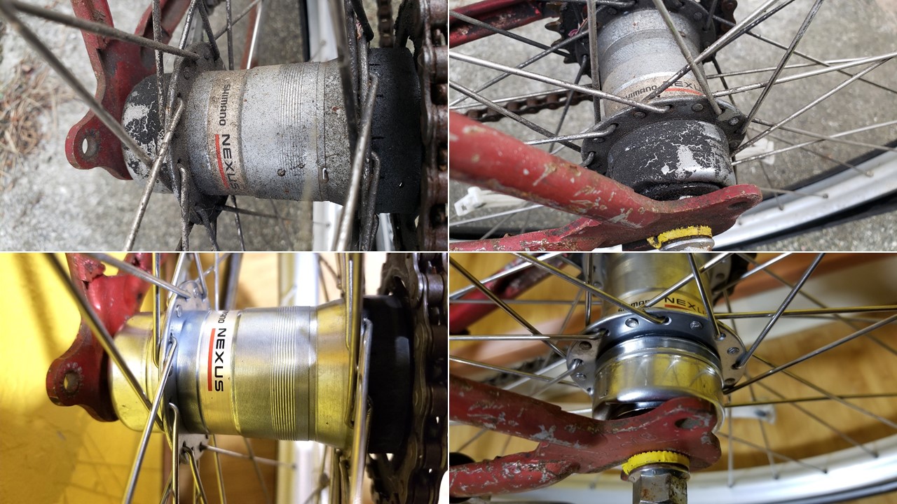 This classic Schwinn Typhoon Deluxe was upgraded before I got it with a modern 26″-diameter rear wheel and a Shimano Nexus 3-speed internal hub and twist shifter. The original front wheel uses a Schwinn 26x2x1-3/4″ tire. More info on this bike in the 1965 Schwinn Catalog. We preserved the original “flamboyant red” color of the curved frame and fork with a coat of wax.