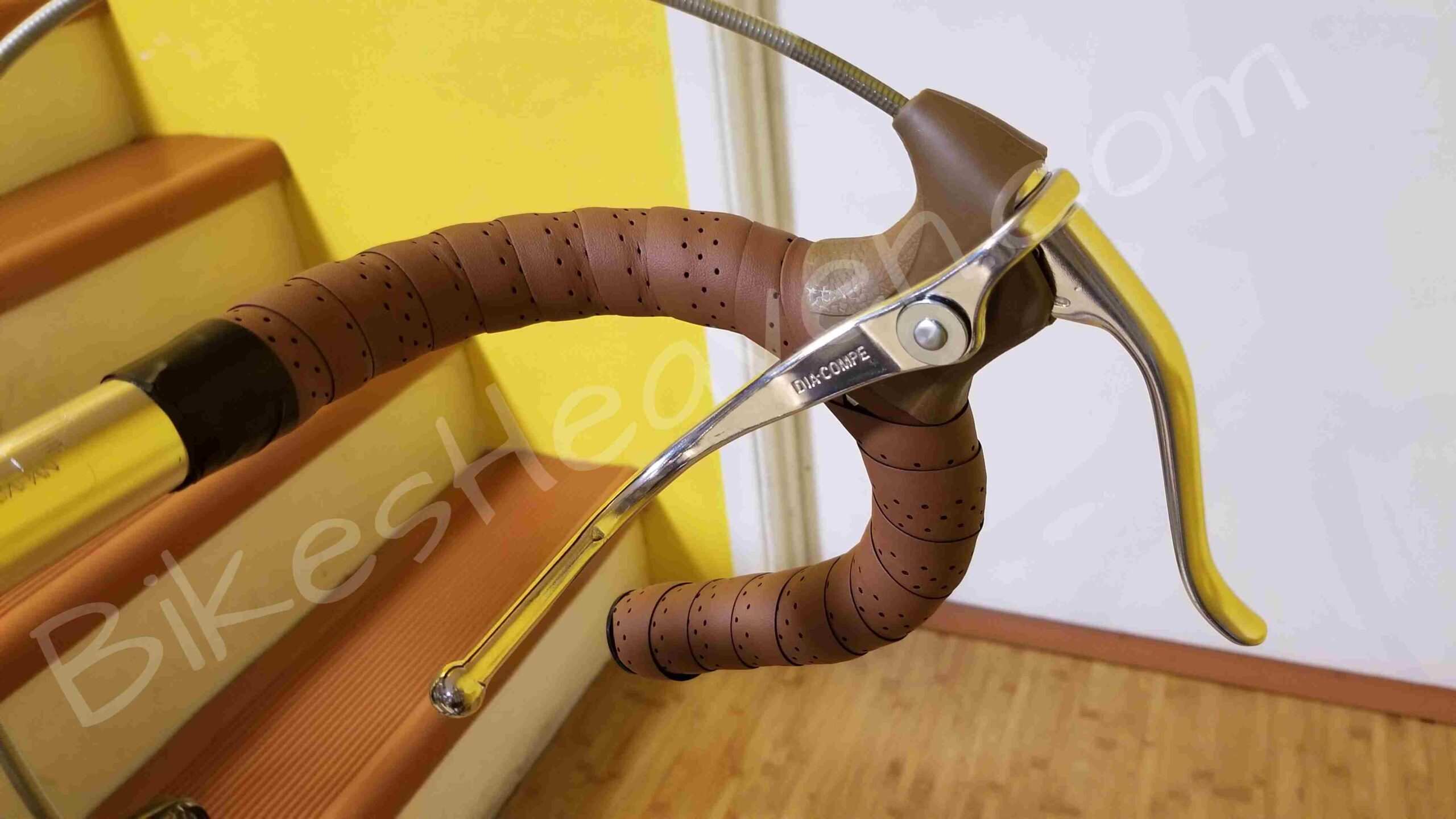 We replaced the original brakes with Dia-Compe double brake levers a.k.a. ‘suicide levers’, and added matching brown bar tape and saddle. Look at the last few photos to see the new additions.
