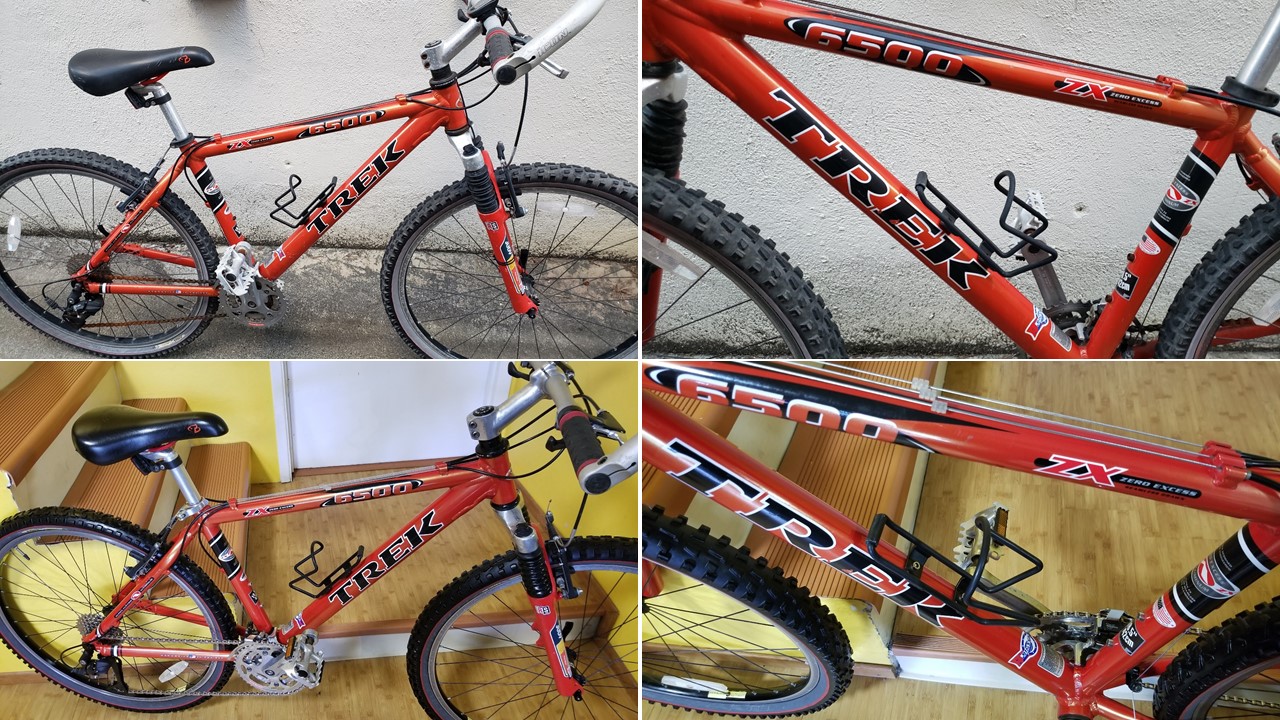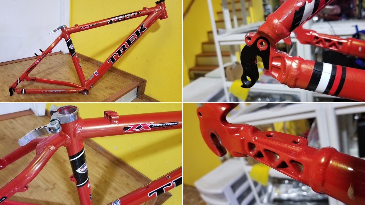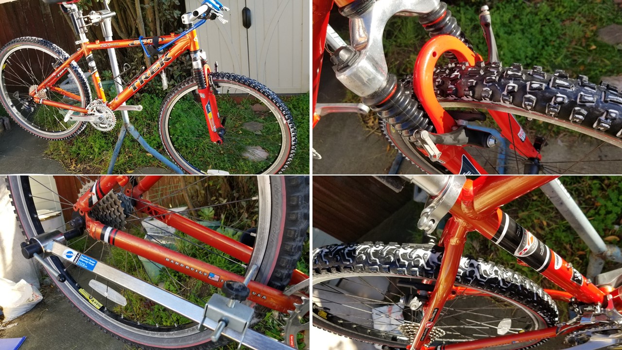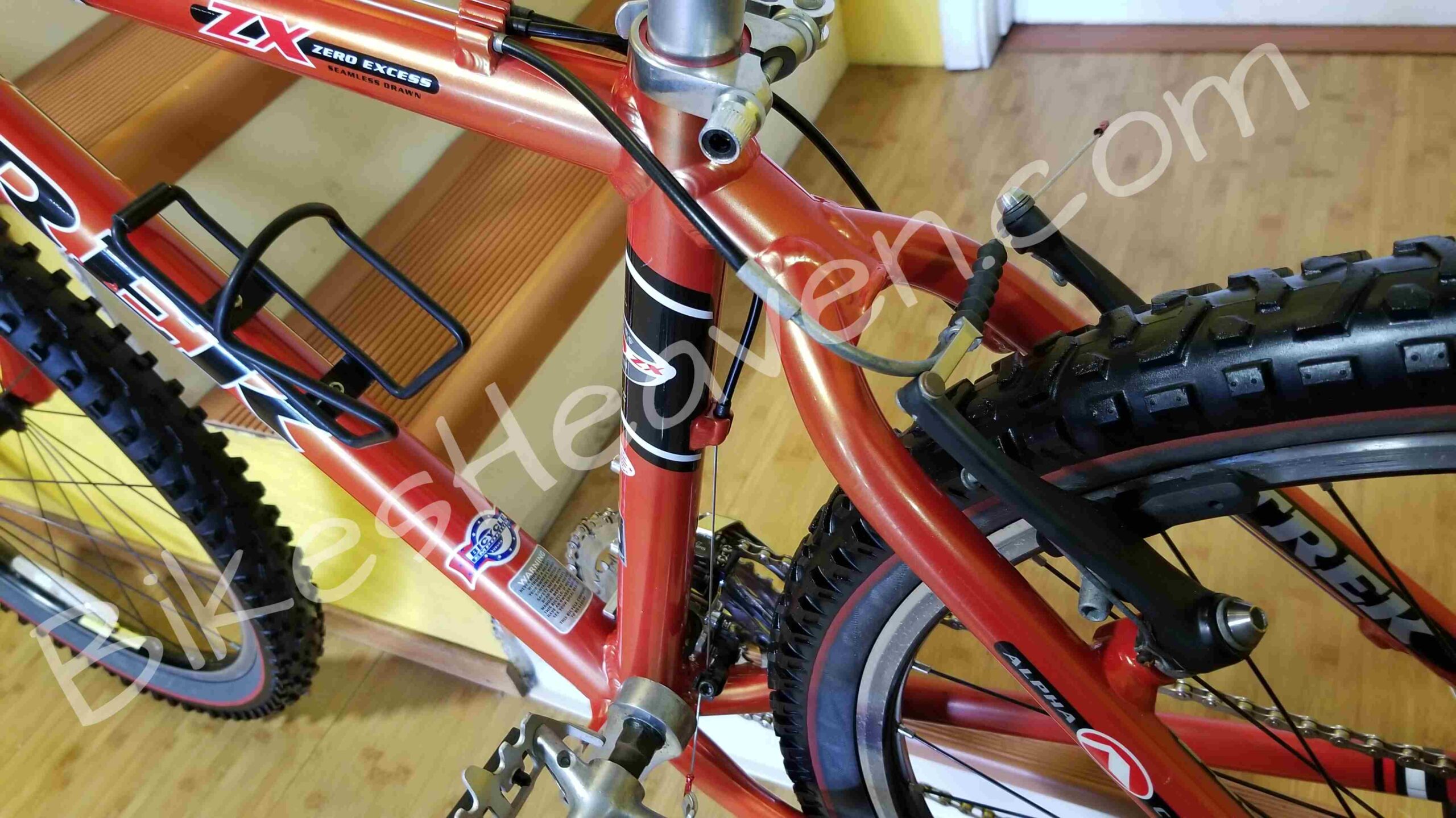 This is a classic, one of the last Trek bikes, handmade in the USA. Trek aluminum alloy frames are known for their durability and geometry. This frame is in excellent condition. The color is a highly regarded ‘Dragonfly Orange’. The ZX (Zero Excess) branding on the top tube indicates it was part of Trek’s high-performance aluminum mountain bike line. Key Features: Alpha Custom Aluminum frame (Trek’s proprietary lightweight alloy); RockShox Judy C fork, ICON and Bontrager components (standard factory spec for Trek mountain bikes of the late ’90s), 24-speed Shimano drivetrain. The Bontrager Jones all-terrain tires set still looks great. MSRP: $750.