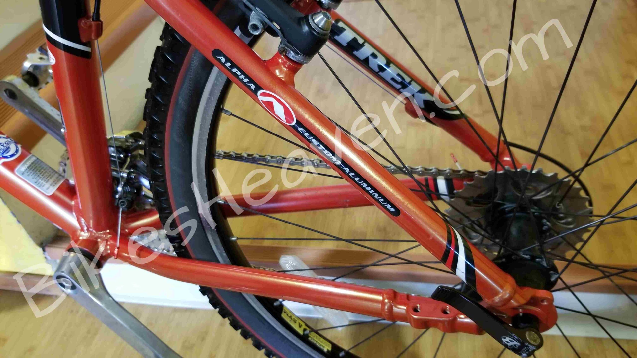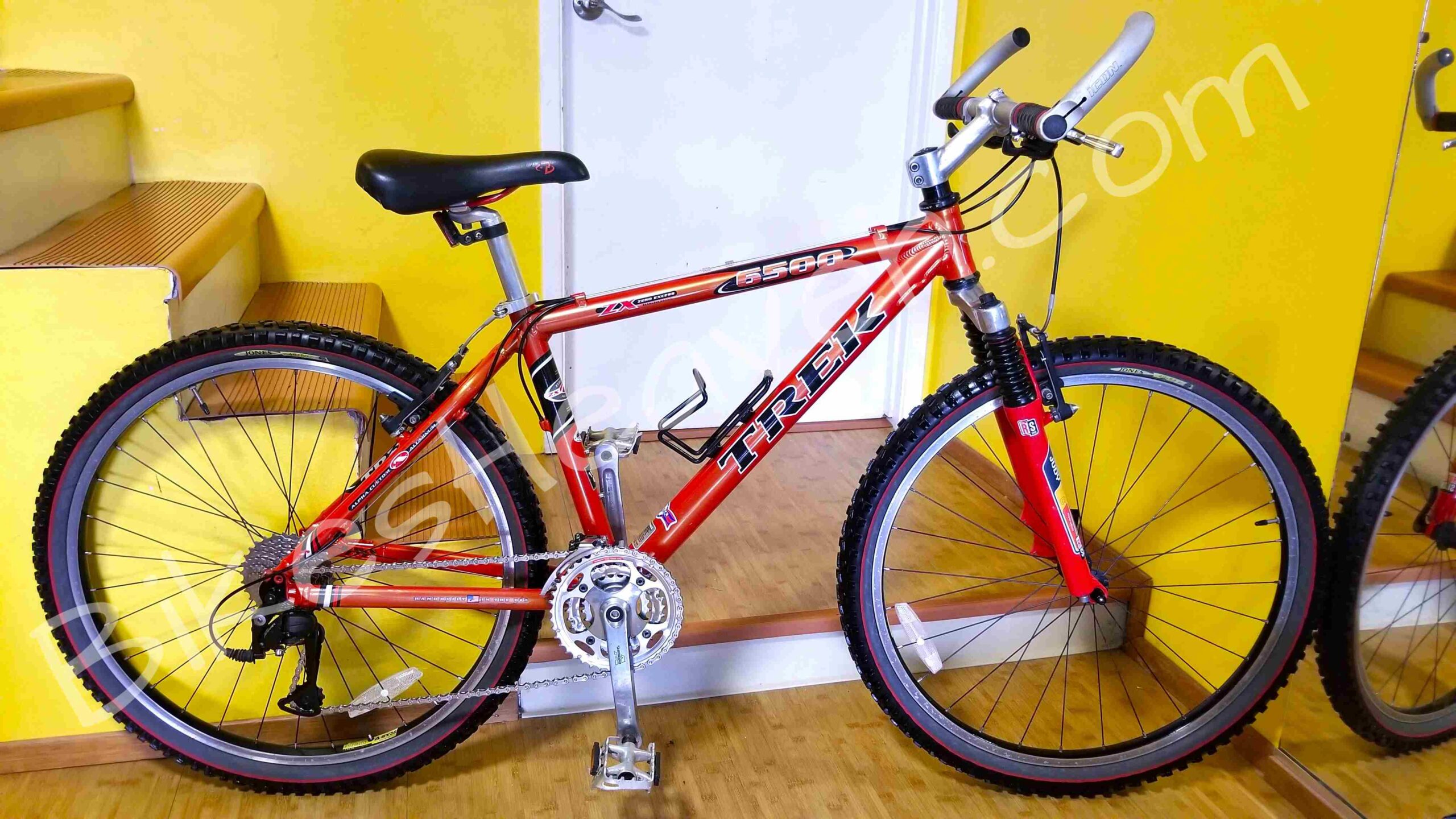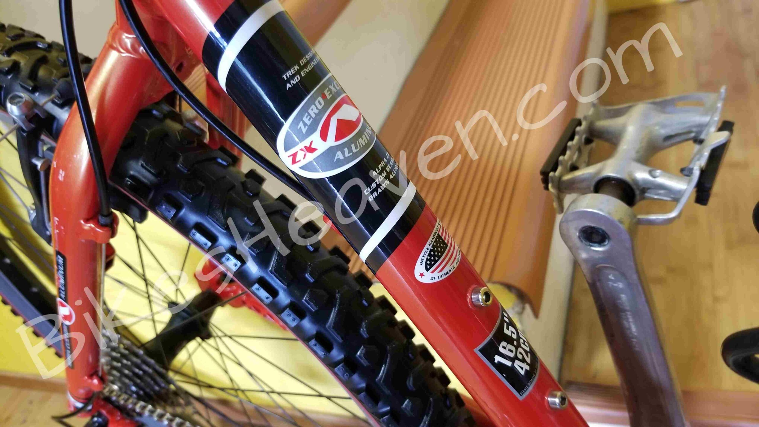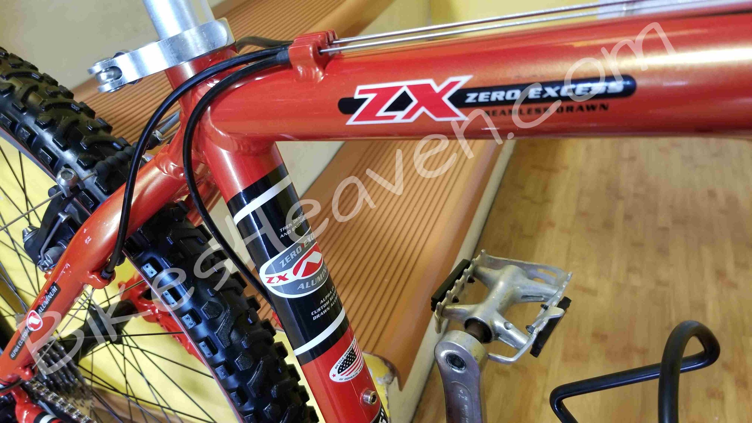 This is a classic, one of the last Trek bikes, handmade in the USA. Trek aluminum alloy frames are known for their durability and geometry. This frame is in excellent condition. The color is a highly regarded ‘Dragonfly Orange’. The ZX (Zero Excess) branding on the top tube indicates it was part of Trek’s high-performance aluminum mountain bike line. Key Features: Alpha Custom Aluminum frame (Trek’s proprietary lightweight alloy); RockShox Judy C fork, ICON and Bontrager components (standard factory spec for Trek mountain bikes of the late ’90s), 24-speed Shimano drivetrain. The Bontrager Jones all-terrain tires set still looks great. MSRP: $750.