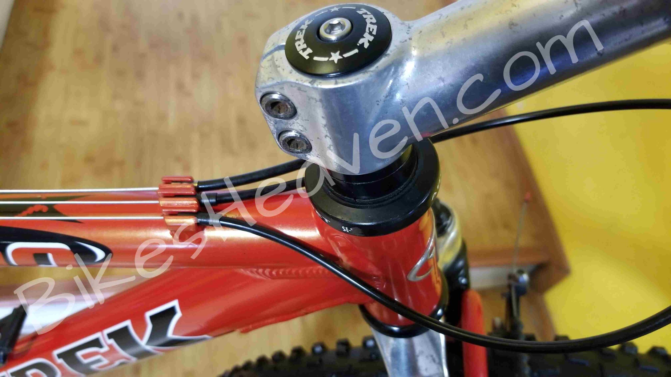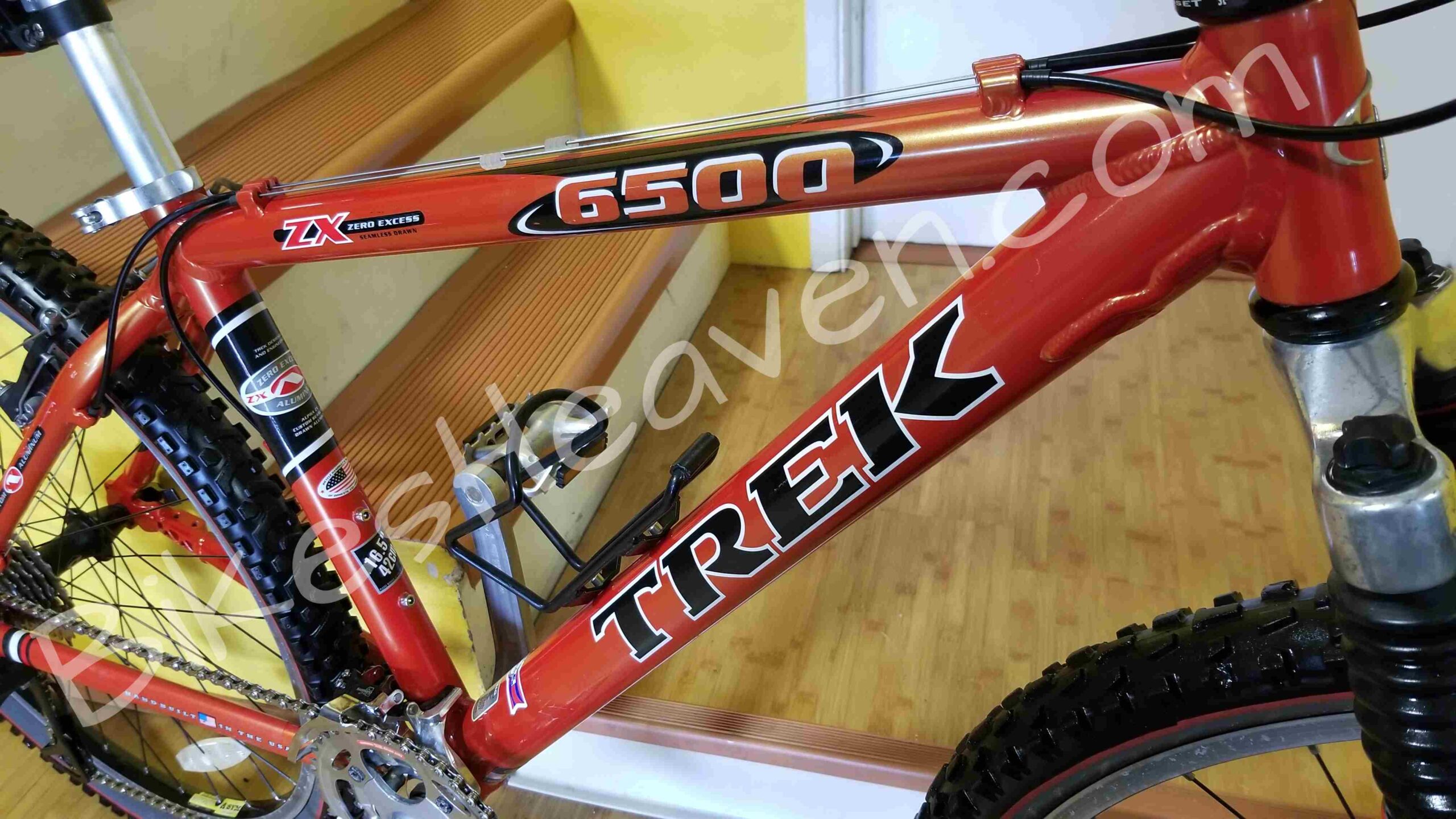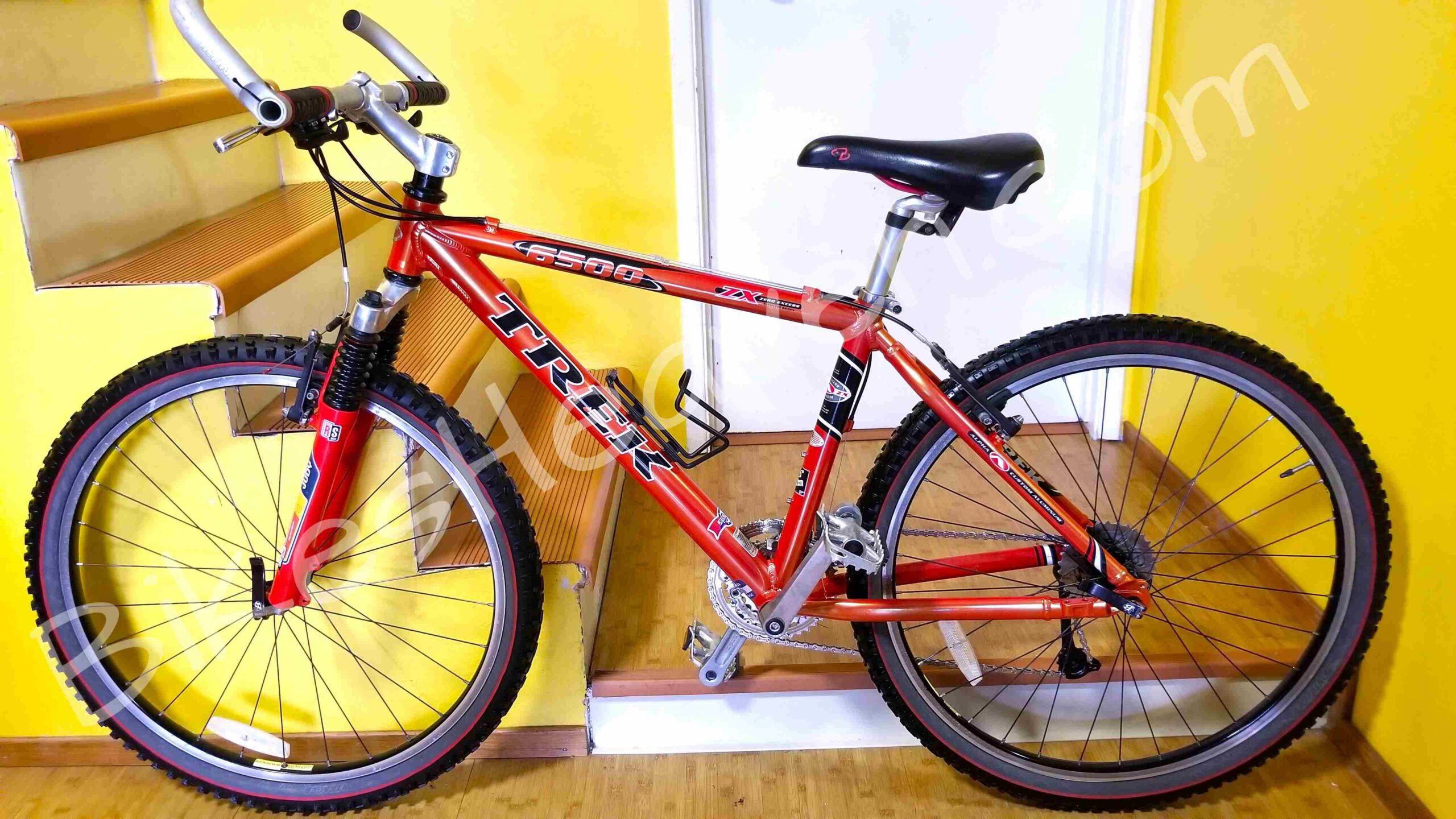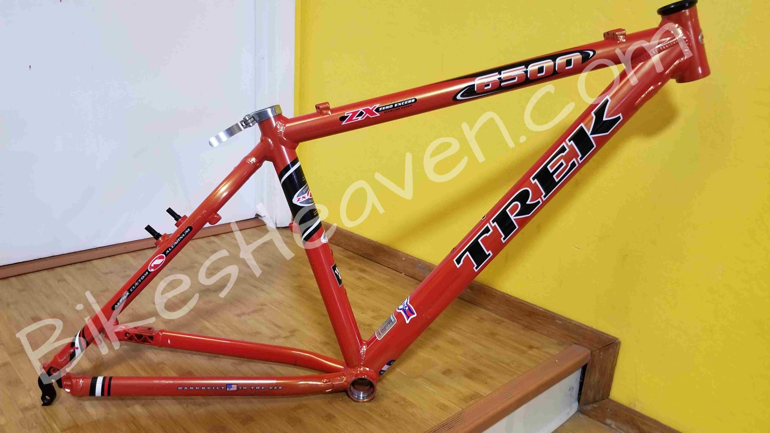 This is a classic, one of the last Trek bikes, handmade in the USA. Trek aluminum alloy frames are known for their durability and geometry. This frame is in excellent condition. The color is a highly regarded ‘Dragonfly Orange’. The ZX (Zero Excess) branding on the top tube indicates it was part of Trek’s high-performance aluminum mountain bike line. Key Features: Alpha Custom Aluminum frame (Trek’s proprietary lightweight alloy); RockShox Judy C fork, ICON and Bontrager components (standard factory spec for Trek mountain bikes of the late ’90s), 24-speed Shimano drivetrain. The Bontrager Jones all-terrain tires set still looks great. MSRP: $750.