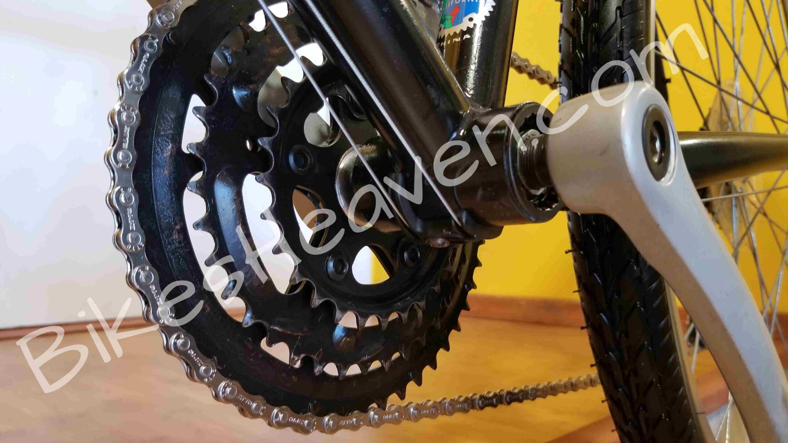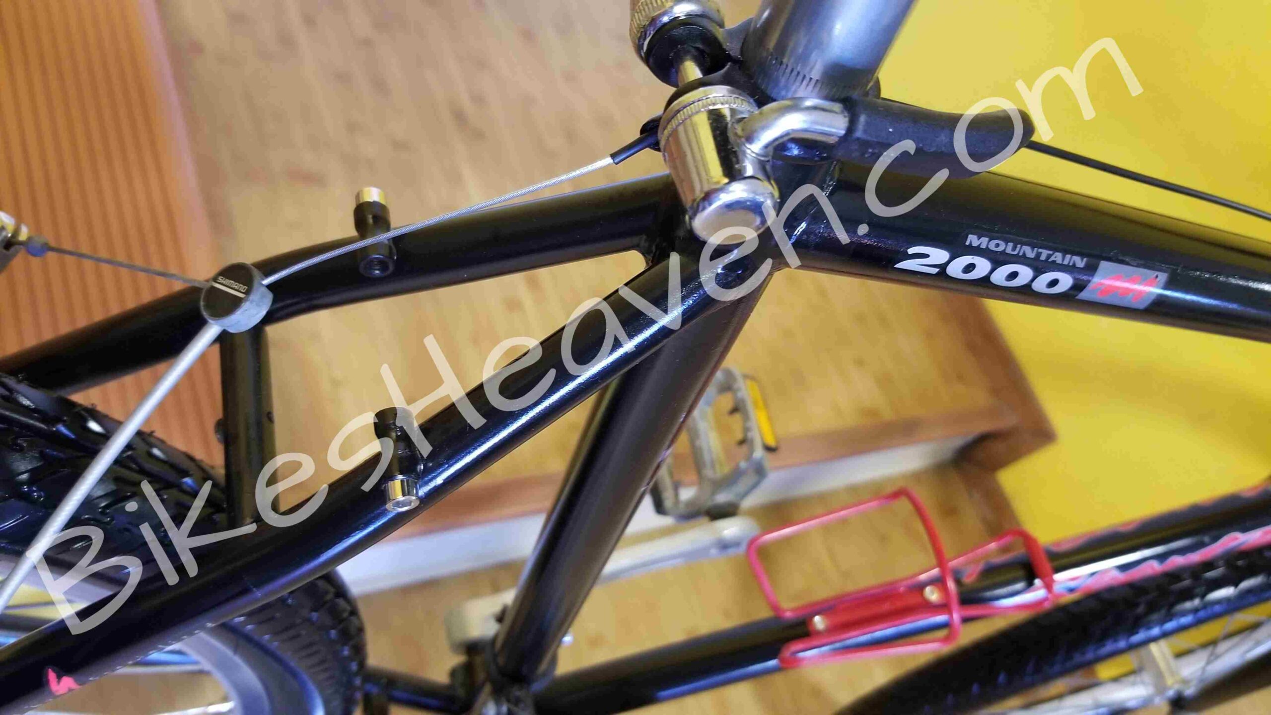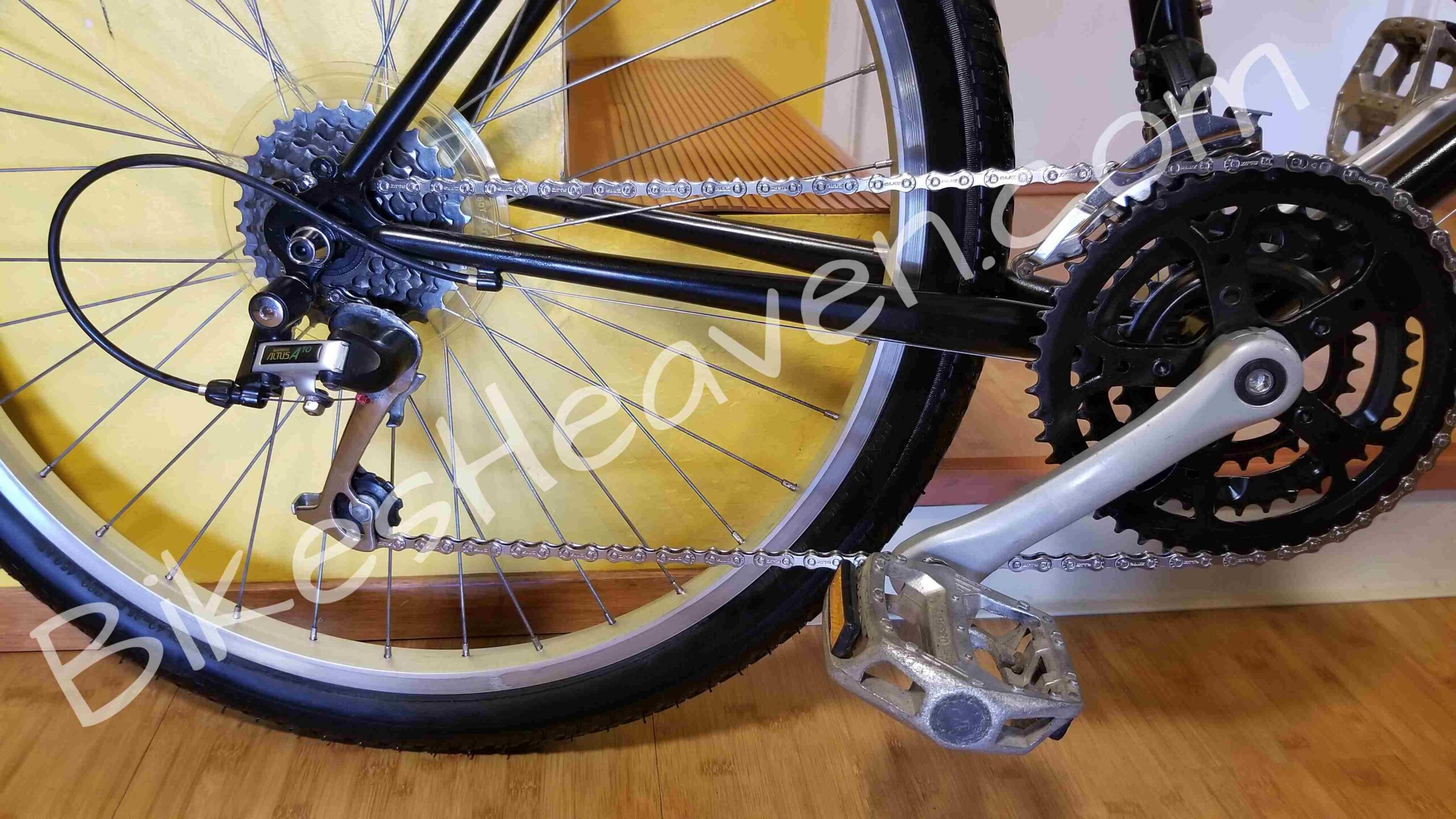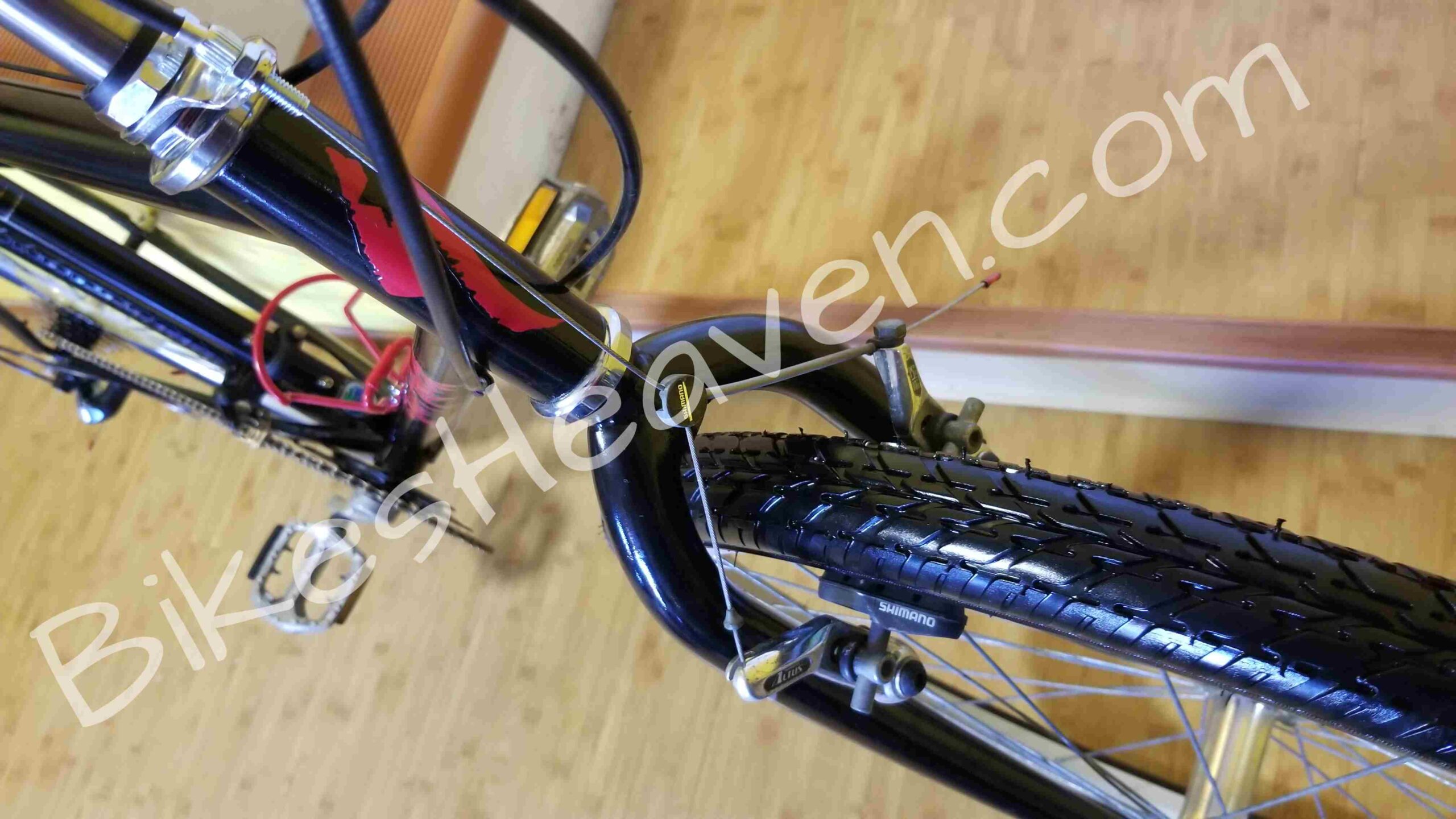 This bike has a 20.5″ ChroMoly steel frame, best for 6.0″-6’7″ riders. I am not sure whether my bike has all its original components. I replaced the badly rusted steel stem, headset, and handlebars with new ones, made from alloy, and kept the sturdy Araya mountain wheels with a 21-speed Shimano drivetrain. The old-school original shifters are replaced with a new Shimano shifters/brake levers combo. A completely rusted, low-end Shimano SIS derailleur is replaced with a new Shimano Altus A10 derailleur from the late 90s.