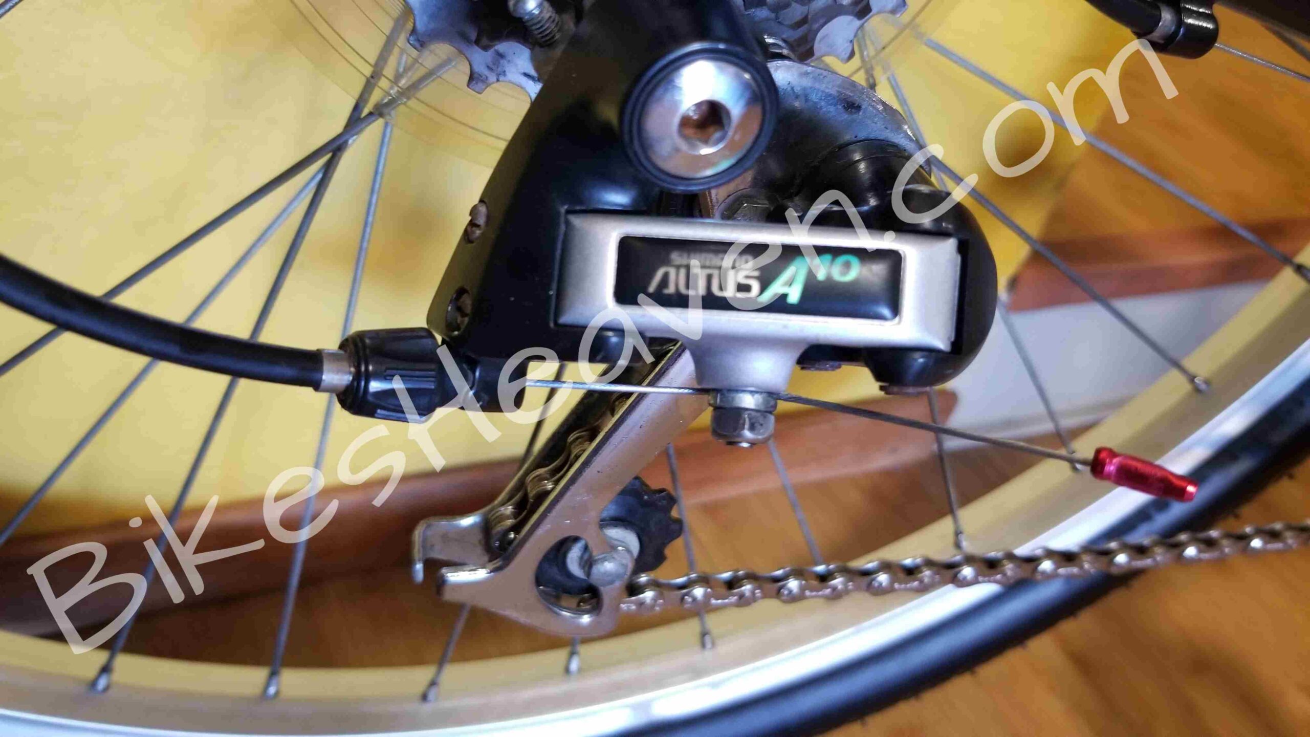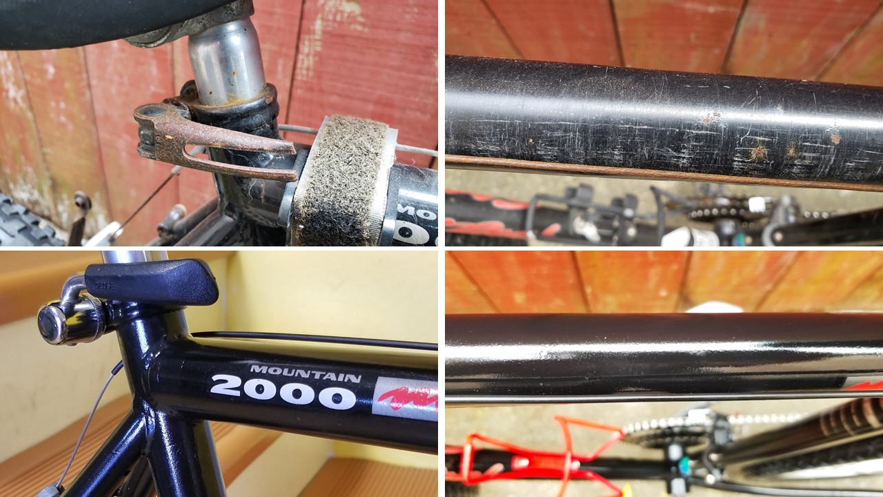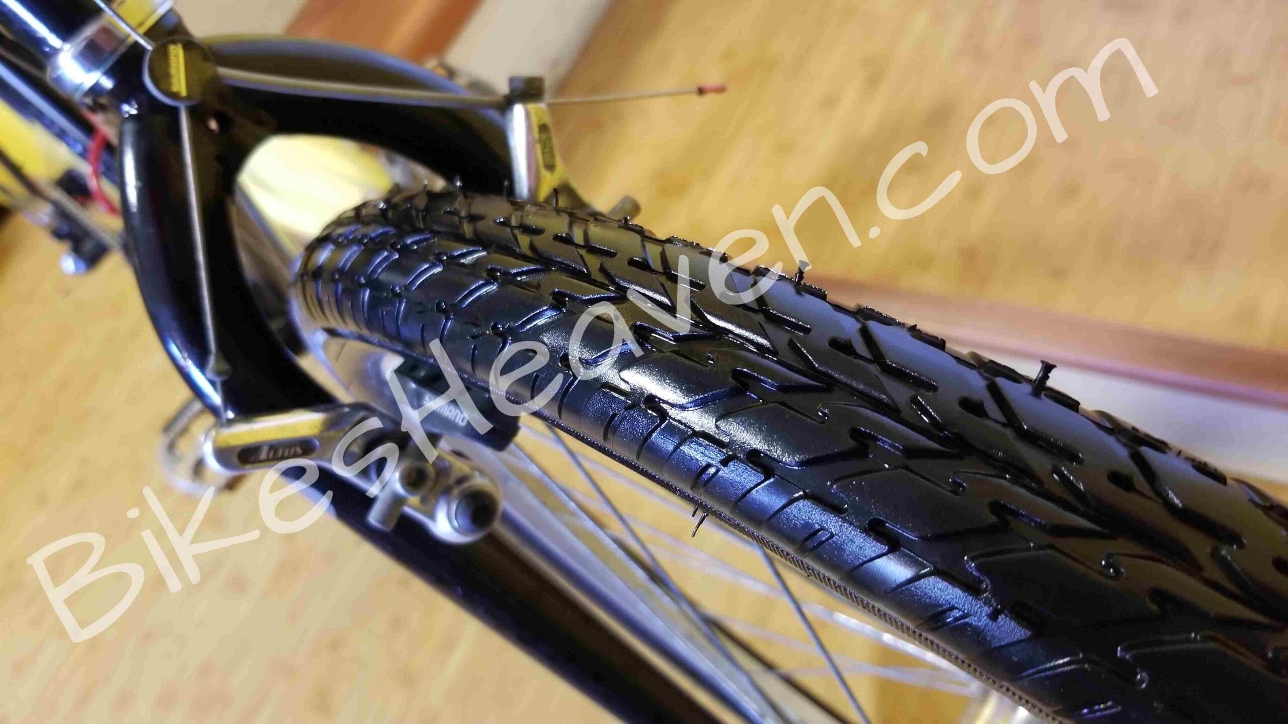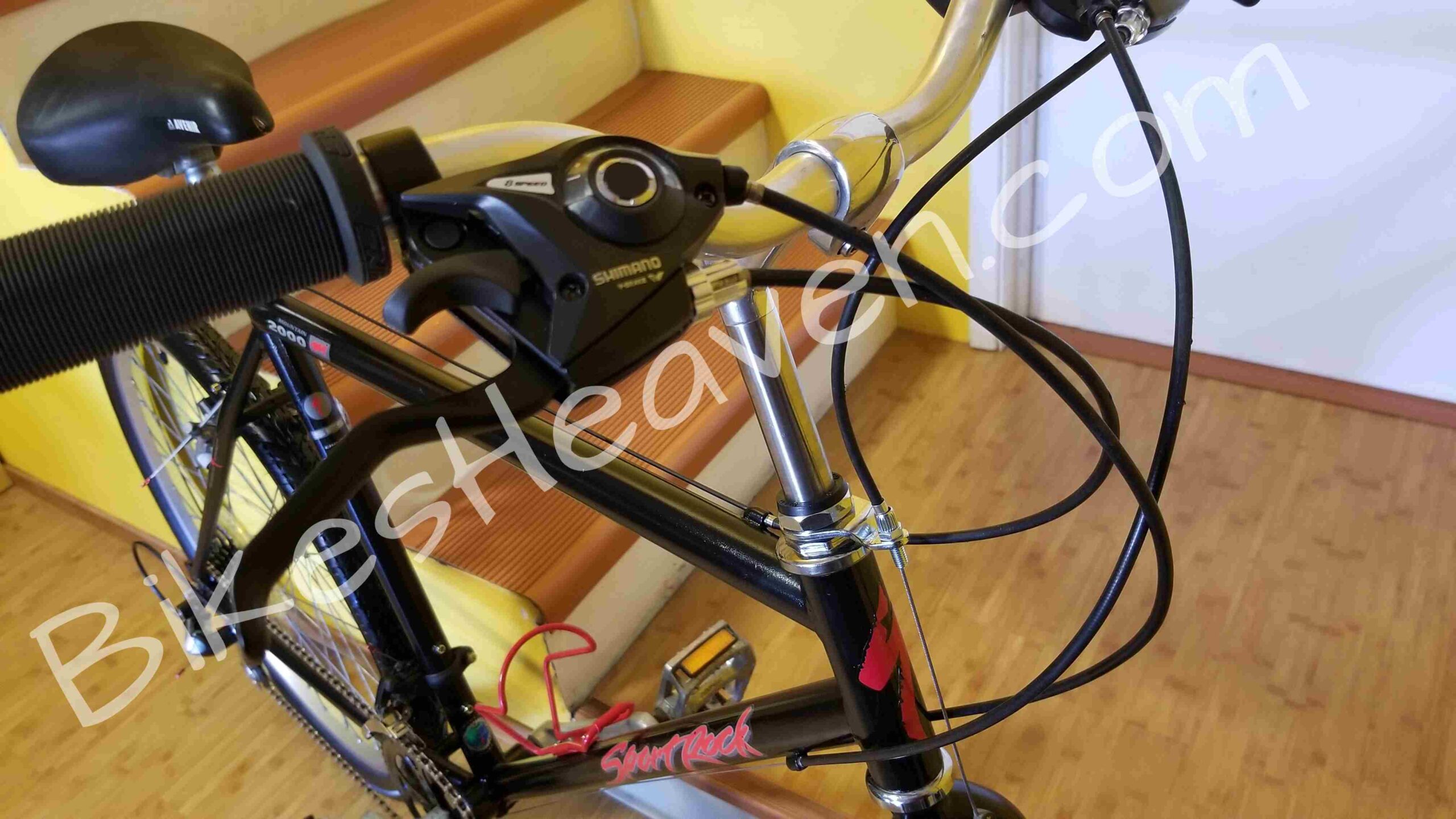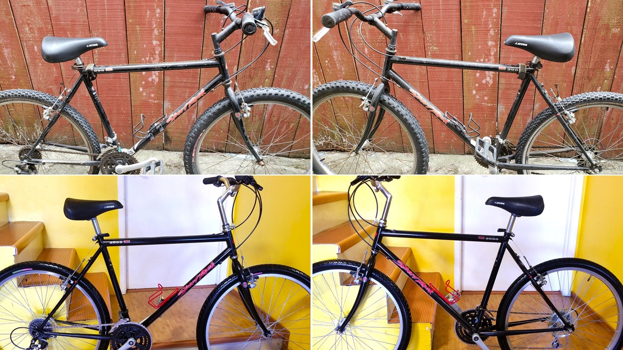 This bike has a 20.5″ ChroMoly steel frame, best for 6.0″-6’7″ riders. I am not sure whether my bike has all its original components. I replaced the badly rusted steel stem, headset, and handlebars with new ones, made from alloy, and kept the sturdy Araya mountain wheels with a 21-speed Shimano drivetrain. The old-school original shifters are replaced with a new Shimano shifters/brake levers combo. A completely rusted, low-end Shimano SIS derailleur is replaced with a new Shimano Altus A10 derailleur from the late 90s.