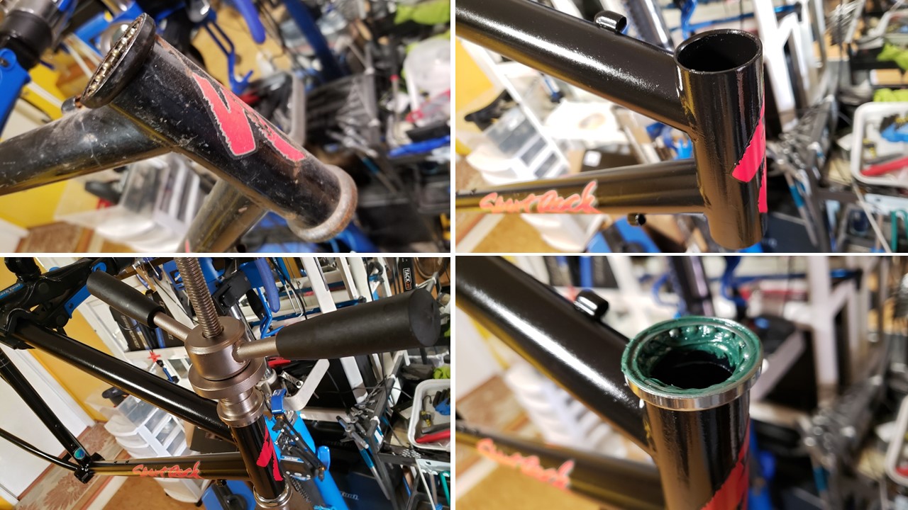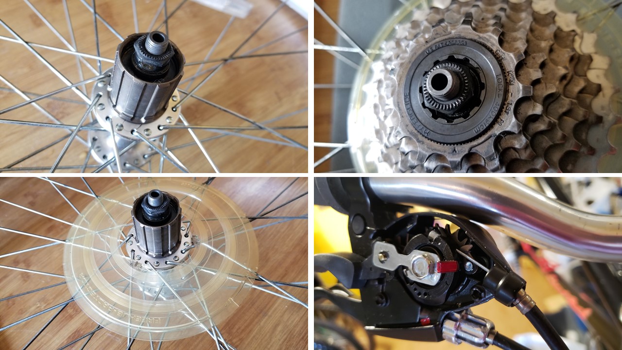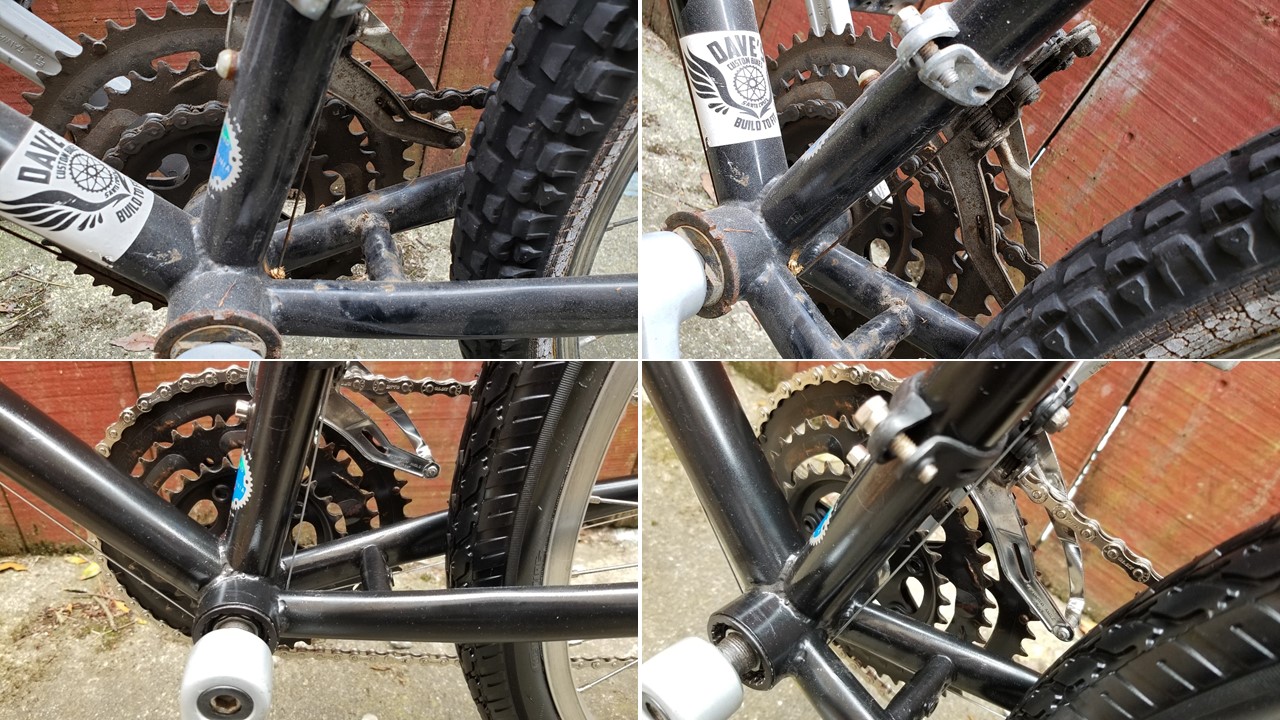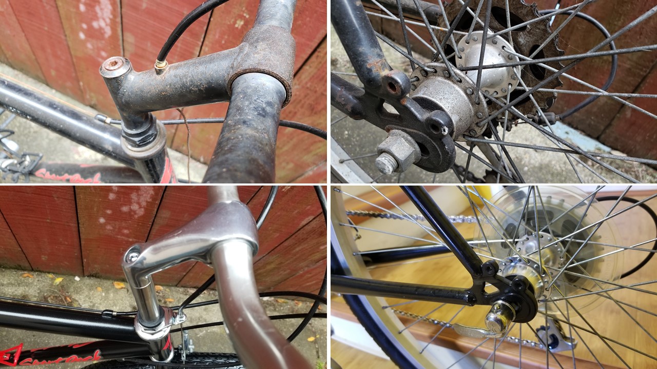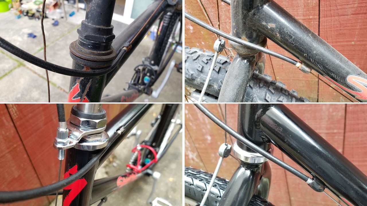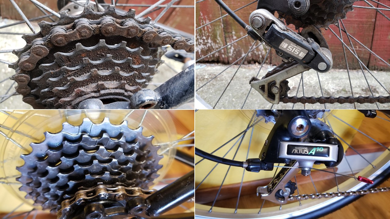 This bike has a 20.5″ ChroMoly steel frame, best for 6.0″-6’7″ riders. I am not sure whether my bike has all its original components. I replaced the badly rusted steel stem, headset, and handlebars with new ones, made from alloy, and kept the sturdy Araya mountain wheels with a 21-speed Shimano drivetrain. The old-school original shifters are replaced with a new Shimano shifters/brake levers combo. A completely rusted, low-end Shimano SIS derailleur is replaced with a new Shimano Altus A10 derailleur from the late 90s.