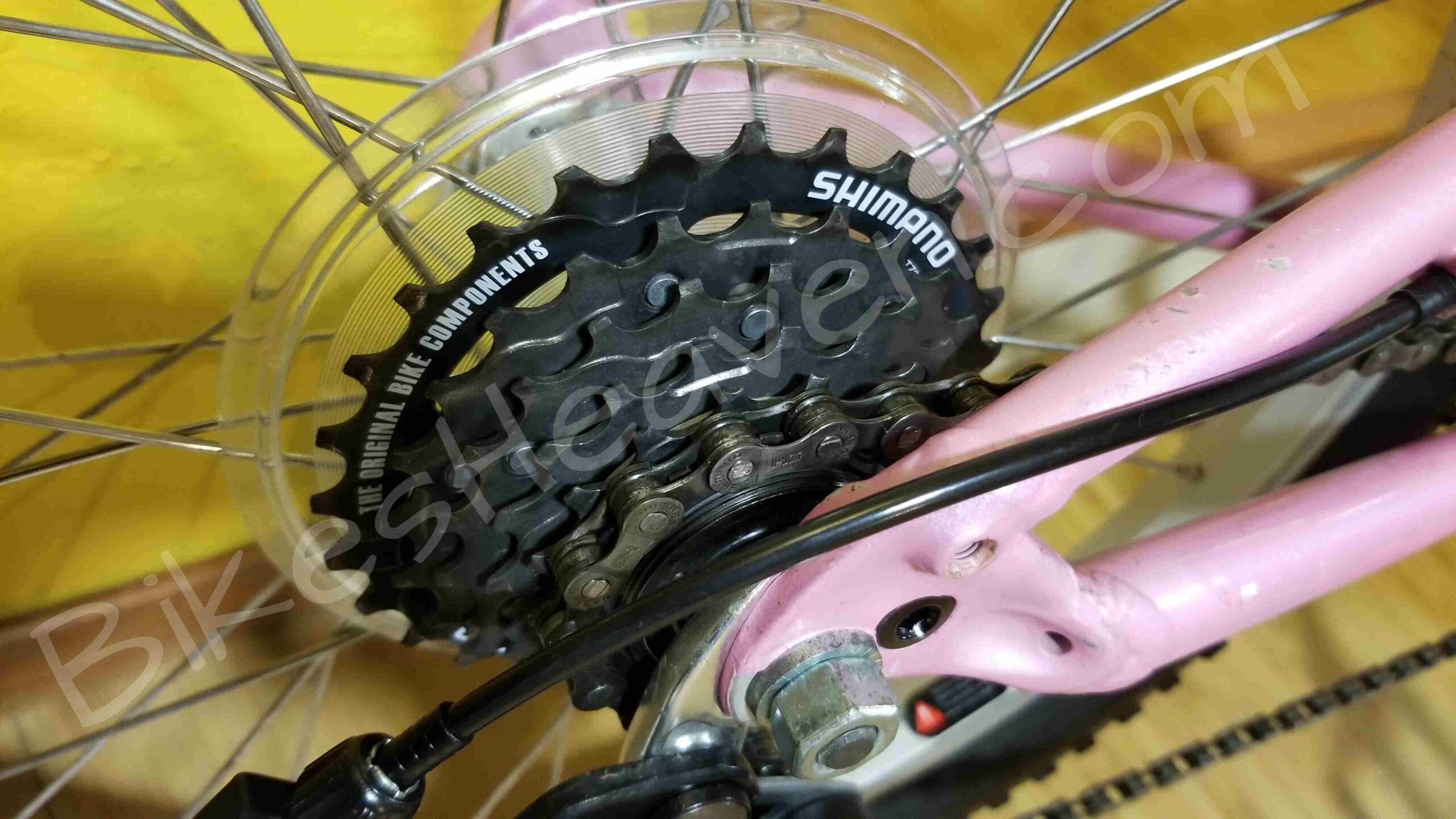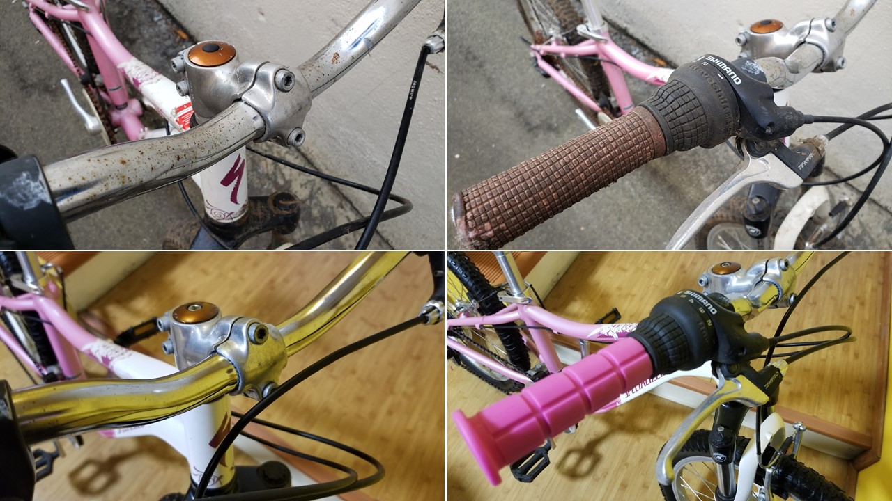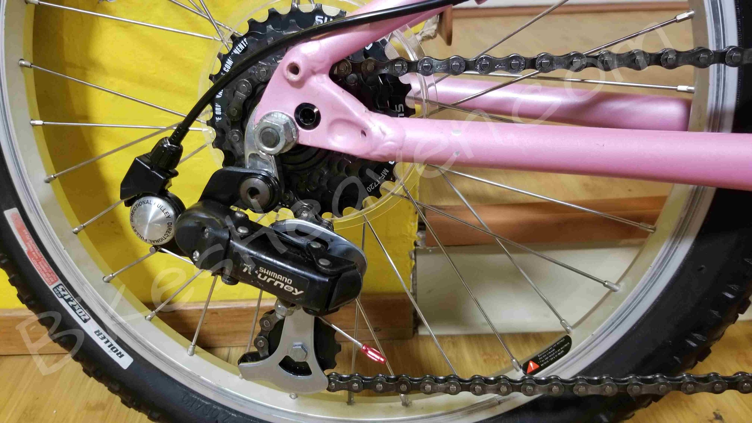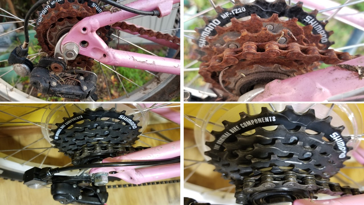 I got this bike with a badly rusted chain, a crippled derailleur hanger, a broken chain roller, badly scratched handlebars, and rust spots on the steel fork. I deep-cleaned this bike, de-rusted components, and installed a new saddle, handlebar grips, and cables.