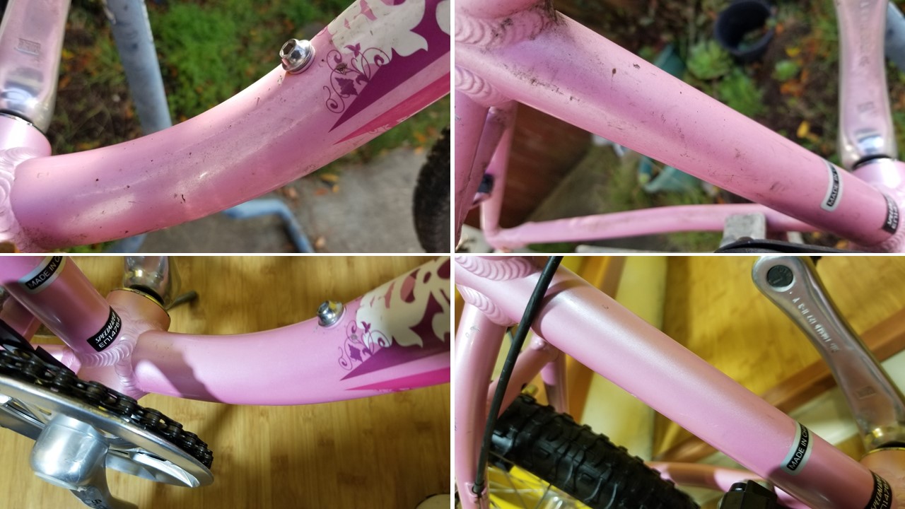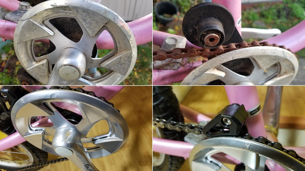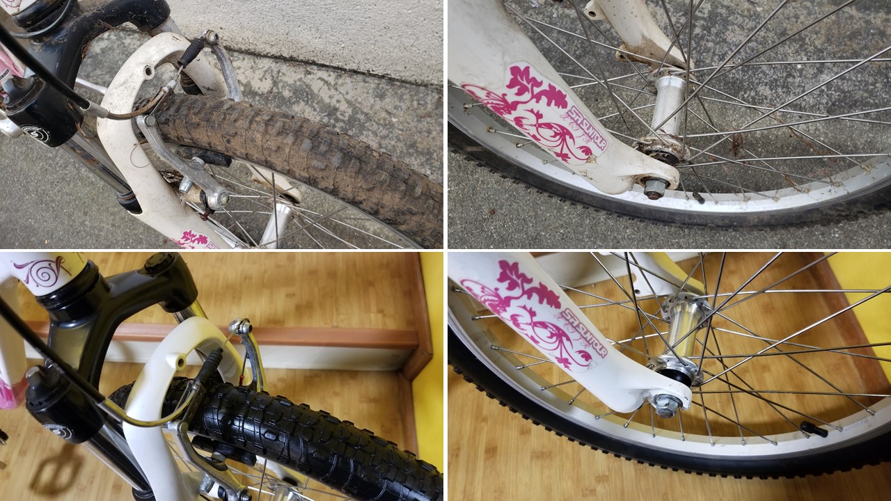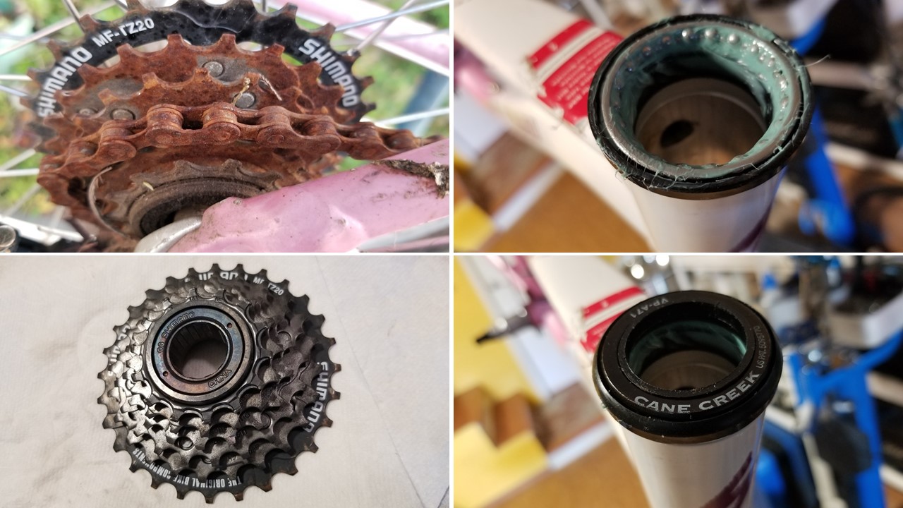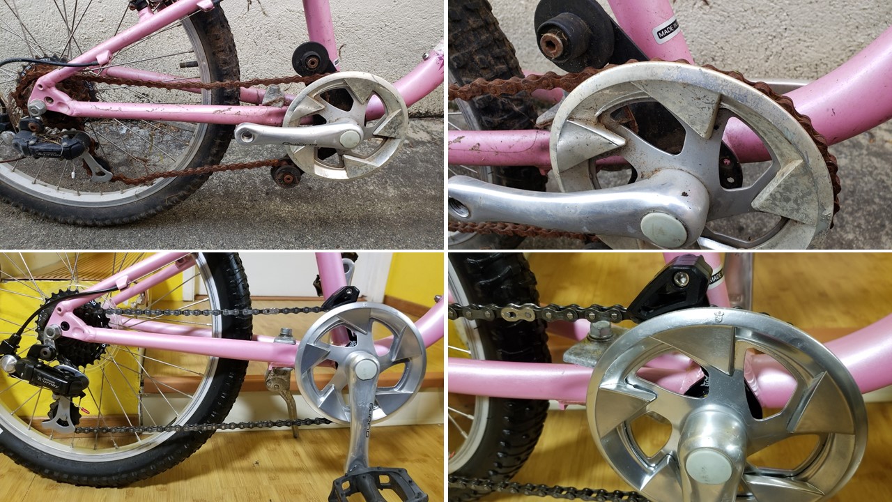 I got this bike with a badly rusted chain, a crippled derailleur hanger, a broken chain roller, badly scratched handlebars, and rust spots on the steel fork. I deep-cleaned this bike, de-rusted components, and installed a new saddle, handlebar grips, and cables.